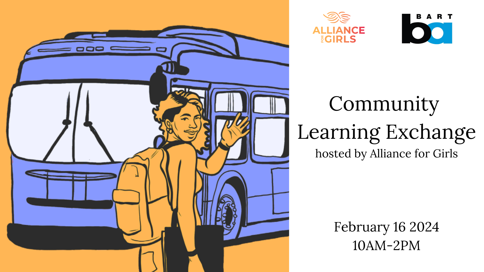 Please join us on Friday February 16th for our Community Learning Exchanges (CLX) - a facilitated intergenerational and interactive workshop where participants will get the opportunity to reimagine how BART evaluates issues of safety, specifically when it comes to sexual harassment and gender-based violence - hosted by Alliance for Girls and BART. The CLX is for BART student riders, girls and gender-expansive youth of color, community leaders, and adult riders.